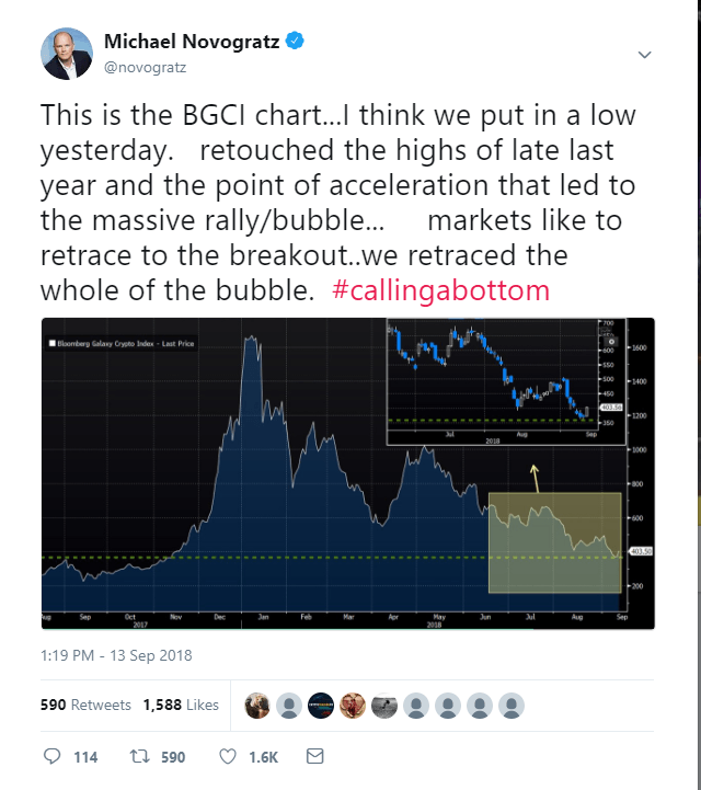 The cryptocurrency market has bounced again this week, led by Bitcoin’s move higher to trade $6,500 level. The market capitalization for the overall space is now back above $200 billion. In a vote of confidence for the market, billionaire cryptocurrency investor Mike Novogratz suggested that an important low had been made.