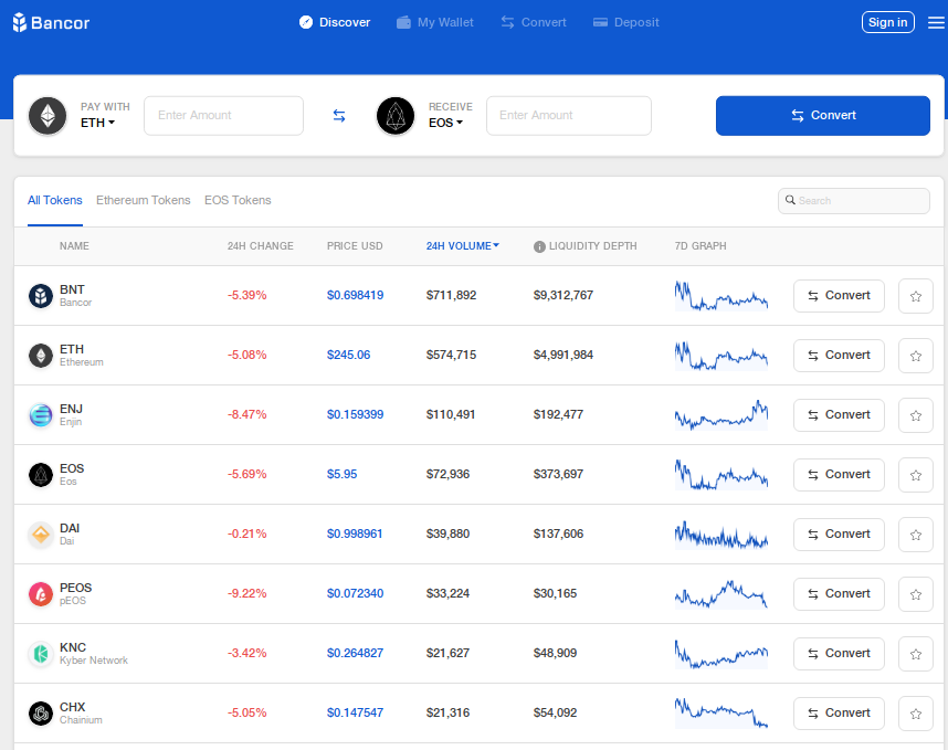 The platform’s native token, BNT, serves as a smart token hub connecting all other tokens in the network, thereby enabling instant trades among any of the supported assets. Bancor charges no fees itself, although the complexity of its operational logic may incur higher than usual gas usage. Bancor also supports cross-chain conversions and exchange (e.g., an ERC-20 for an EOS), using the BNT token as an intermediate (e.g., REP for Dai goes through the hops of REP for BNT, then BNT for Dai).