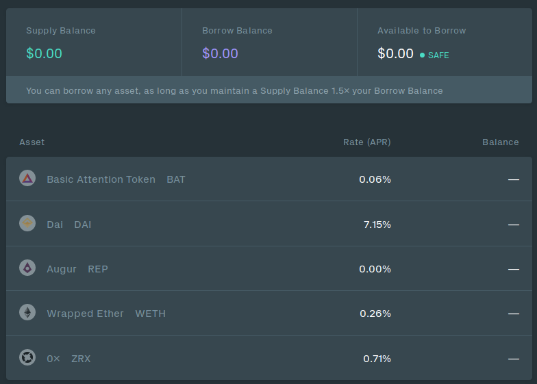 Presently, among available assets for staking in the system, there’s support for BAT, REP, and ZRX in addition to the base (WETH, Dai). How it works is one supplies asset to the Compound Protocol and gets cTokens in return, which represent one’s balance in the protocol on the basis of which interest is earned. How much tokens one receives depends on various collateral factors (quality, liquidity, etc.)