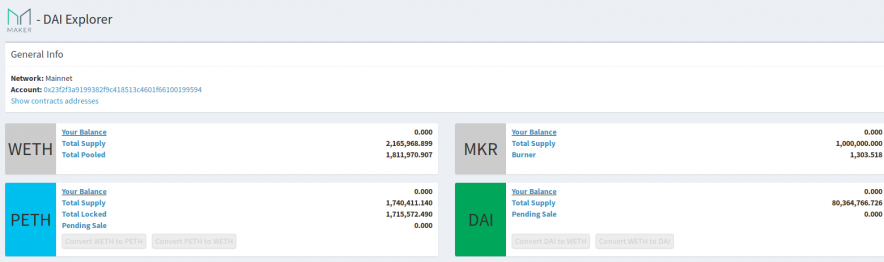Other available tools and system web interfaces (not including command-line tools) are makerscan.io (system explorer), mkr.tools (overall system status, parameters, metrics and stats, visualizations and historical records) and dai.makerdao.com (dashboard and control interface for the Ethereum address presently connected to MetaMask – operations such as wrapping and unwrapping ETH, converting WETH to Dai and vice versa, opening and managing CDPs, etc.).