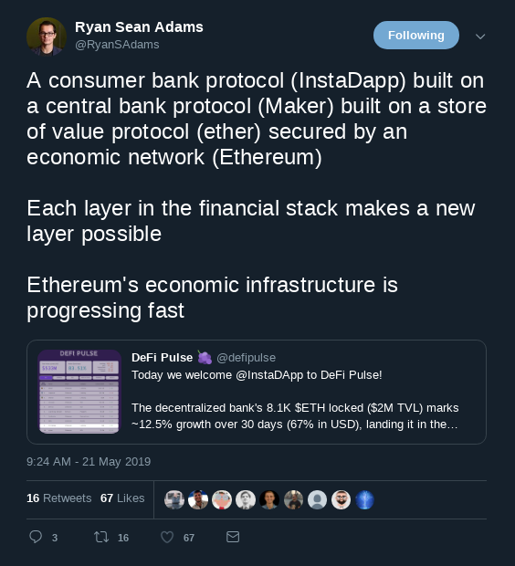 Most recently InstaDapp was also added in the list. InstaDapp provides a more intuitive interface as an overlay of the MakerDAO protocol, such that it’s optimized for users lacking more advanced technical or financial experience, allowing for keeping track of CDPs via email or Telegram notifications and perform various bundled operations in single transactions, saving gas. The platform also integrates Uniswap and Kyber, letting users manage their Uniswap liquidity pools. The team plans to add integration with other protocols and additional features, driving DeFi mainstream adoption.