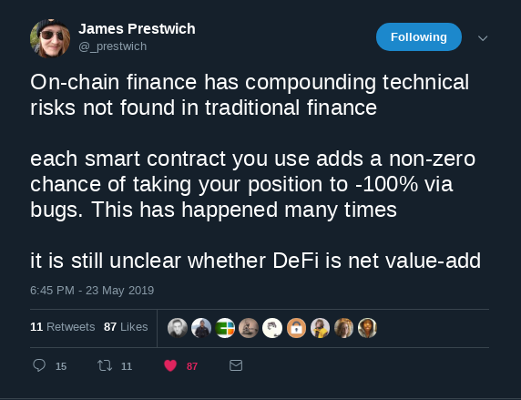 DeFi is “trustless” in a human sense (i.e., no one can steal or cheat, technically), but not in a functional sense (as in when a developer deliberately booby traps his contract or dApp with malicious code or when a bug is discovered and suddenly comes to light). In place of traditional regulators, we have a nascent industry of contract code auditors and tools (e.g., OpenZeppelin, the Vyper language for more strictly articulating contract logic, etc.), best practice documentation and frameworks for smart contracts and dApp development (Truffle, Embark etc.) and so on.