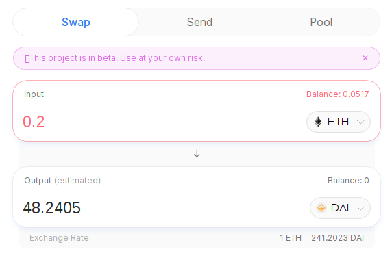 Uniswap is a fully decentralized on-chain protocol for token exchange on Ethereum that uses liquidity pools instead of order books. Anyone can quickly swap between ETH and any ERC20 token or earn fees by supplying any amount of liquidity. And anyone can create a market (i.e., liquidity pool) by supplying an equal value of ETH and an ERC20 token.