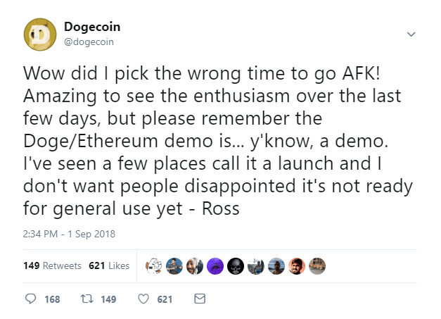 The Dogecoin development team were quick to burst the “Dogethereum” bubble by saying in a tweet,