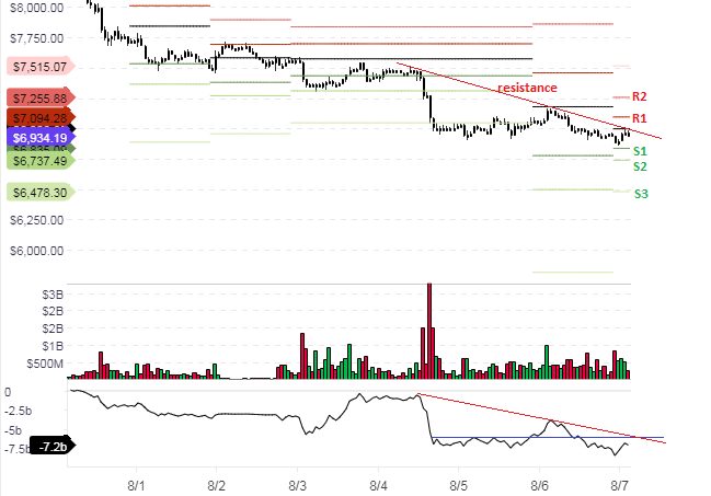 The hourly chart shows the outlook for intraday trades. The price is firmly being resisted at the daily pivot, where there also happens to be a convergence point of the sloping resistance line.
