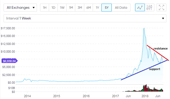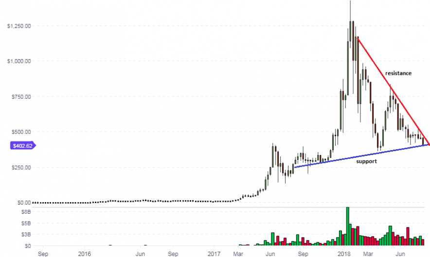 The weekly chart for ETH/USD shows the presence of a triangle pattern, as has been the case with most of the top cryptocurrencies.