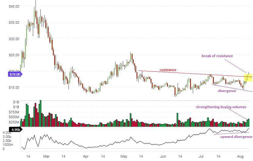 There is also a clear positive divergence, which is now playing out as a divergence correction to the upside by the price action. This is also supported by an increase in buying volumes. This provides a bullish outlook for ETC/USD in the medium term.