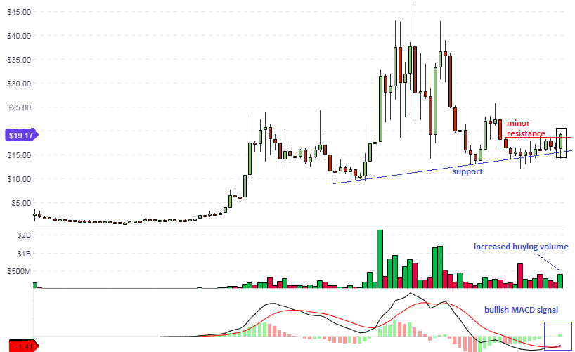 The long term chart shows that ETC/USD has found a firm upward trendline support, from which the weekly candle has taken off in its upward swing. This candle has also breached the minor resistance line formed in the last 11 weeks, though it has not closed above this level yet. Bullish support is also seen in the MACD indicator as well as the increased buy volumes.