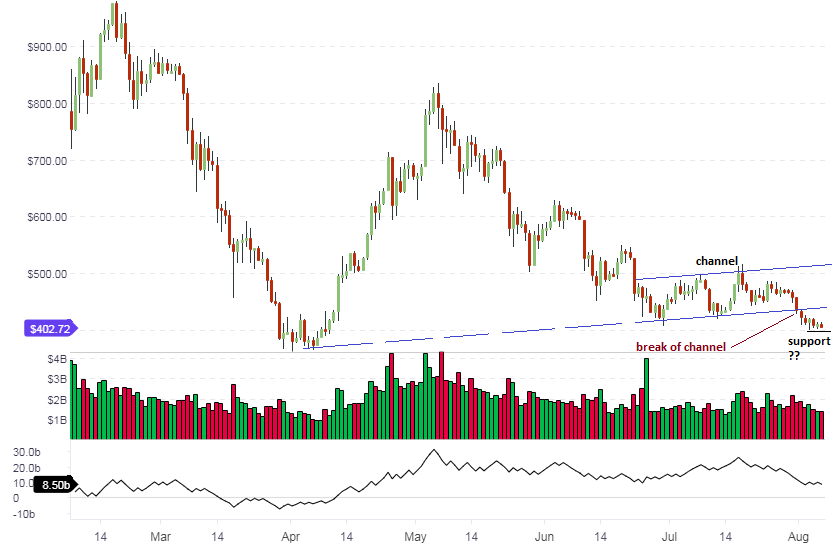The daily chart shows that the downside move of the price action following the lower channel line break has temporarily stalled and is searching for direction. This is in conformity with the view on the weekly chart, which shows the price action being held up at the lower trendline support line.