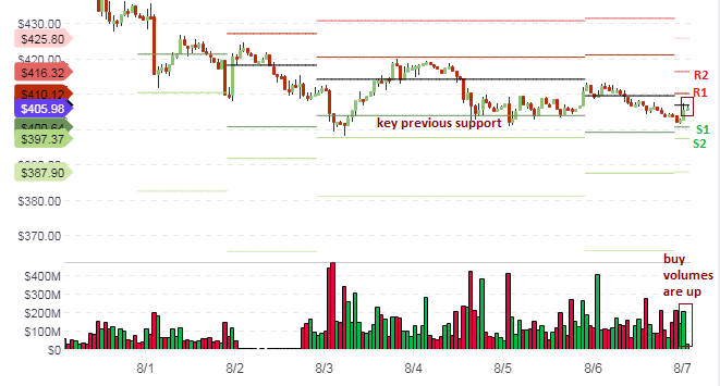 The blue resistance line was taken out by this move. This line intersects the R1 pivot. Therefore, day trades should buy on a dip to the R1 pivot, with R2 set as the first profit target.