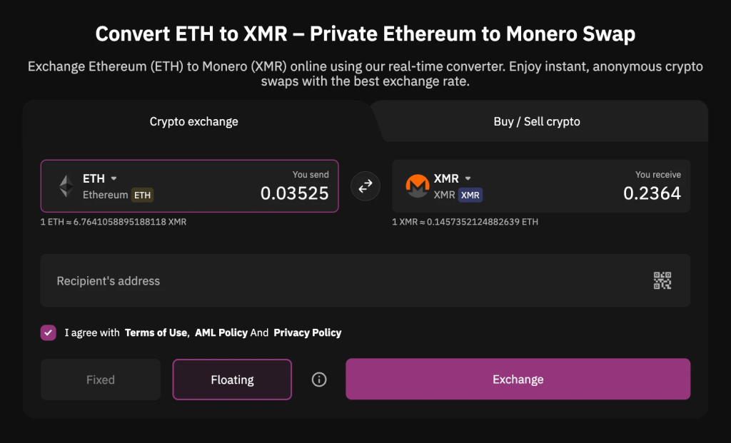 For a simpler, more privacy-oriented route, instant swap services (for example, Quickex) can enable an ETH to XMR exchange without creating an account or submitting personal data. In most cases, you enter the amount of ETH, provide your XMR wallet address, and complete the swap within minutes.