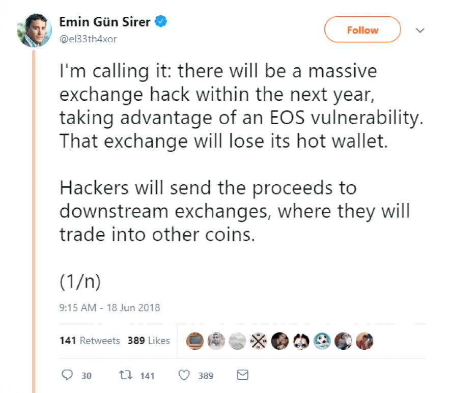 Emin Gun Sirer, a Computer Science professor at Cornell, does not think highly of EOS’ readiness or its governance model.