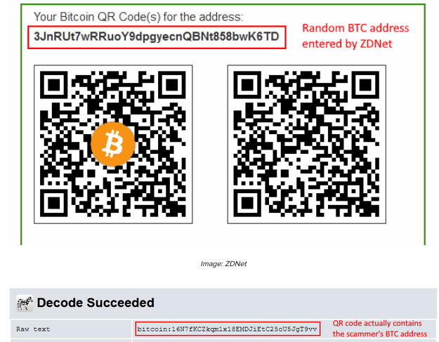 However, online QR code generators are risky. Fake QR code generators can replace your Bitcoin address with an attacker’s address and intercept any payment that you attempt to receive. This image from ZDnet demonstrates the attack: