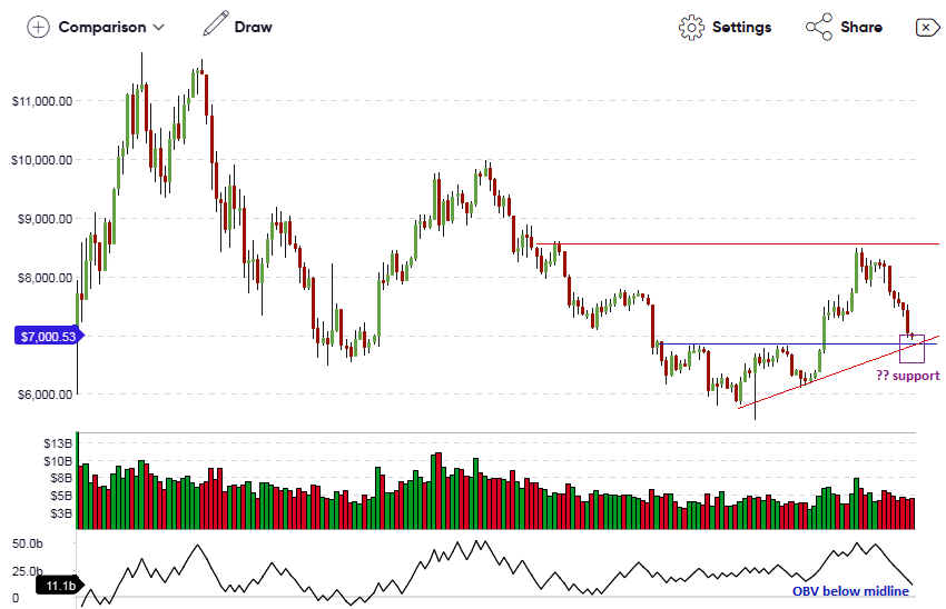 In addition, the price is pushing towards the site of a previous resistance that was broken at the $6800 mark. This area is expected to now function as a support if it is able to hold back the downward slide of BTC/USD. There is also a rising trend line support (red upward slanting line) from the lows of June and July 2018, which move upwards to intersect the identified previously broken resistance that is expected to function as support (blue horizontal line). Therefore, the medium-term outlook is for price to find support at the $6700 to $6800 price level.