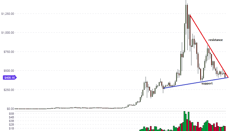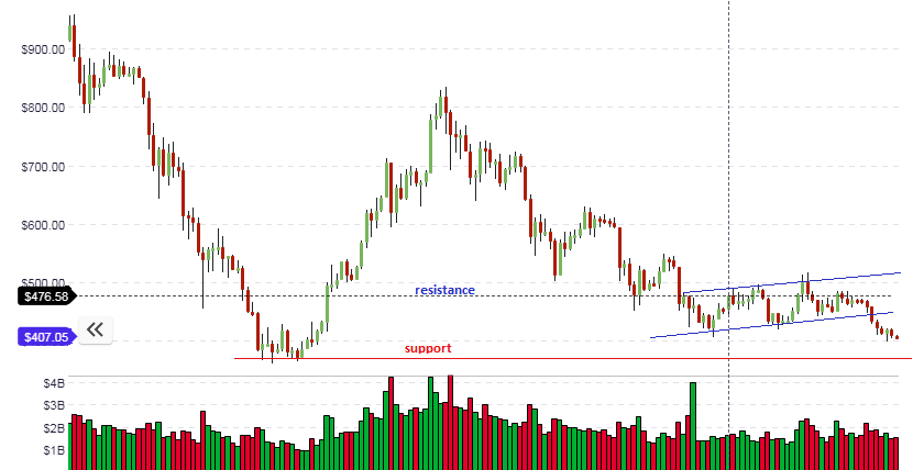 Traders with a medium-term view must therefore wait to see how well this support area will hold. If there is support at that level (close to $400), then we will see the intraday trade setup play along those lines. A look at the intraday charts will show that ETH/USD is presently contained within a saucer formation at the level of the S2 support.