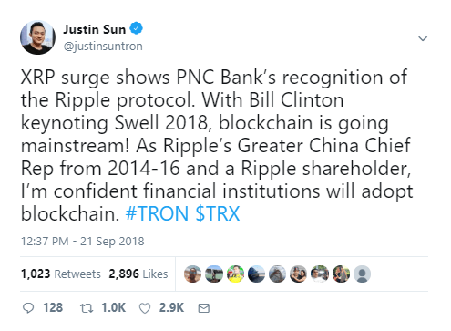 In his tweet, Sun attributes the recent surge in XRP’s marketcap to the newly formed partnership between PNC Bank and Ripple. Sun was previously employed by Ripple as their Chief Representative in China from 2014 to 2016, lending credibility to his speculations that this new partnership is a sign that financial institutions are beginning to look seriously at blockchain technology,