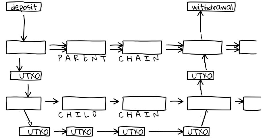 The general outline of the Plasma design so far is such that a child-chain (or side-chain, or an extended tree of side-chains) is anchored to a root chain (via an interfacing on-chain contract). A deposit on the main-chain/root-chain creates a UTXO in the side-chain (a withdrawal pulls it out of circulation from the plasma chain and back into the main chain). State changes in the side-chain are periodically submitted to the root-chain as block headers (Merkle roots) which contain the sufficient information required to prove the correctness of state transitions in a condensed form. Incorrect state transitions are rolled back using fraud-proofs and the order of how exit procedures take place is prioritized by earlier side-chain blocks. A Plasma chain is usually a Proof of Authority chain managed by an operator under specific design constraints.