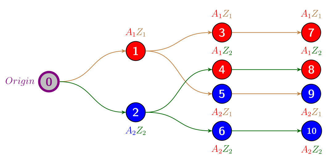 A graph illustrating asset flows: As an Account A1 deposits Z1, an Account A2 deposits Z2 and they trade portions of the deposited assets with one another. New states render older states obsolete as the state of one balance is spent by an updated state in the next node. Source: Gluon Plasma paper.