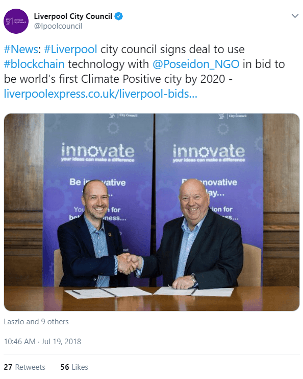Liverpool’s City Council (LCC) plans on using the power of blockchain technology to help Liverpool become the world’s first climate-positive city. The LCC is teaming up with the Malta-based, non-profit Poseidon Foundation to test a blockchain platform that allows for the monitoring and exchange of tokenized carbon credits. The announcement was made on the Liverpool Express site as well as on the council’s Twitter page,