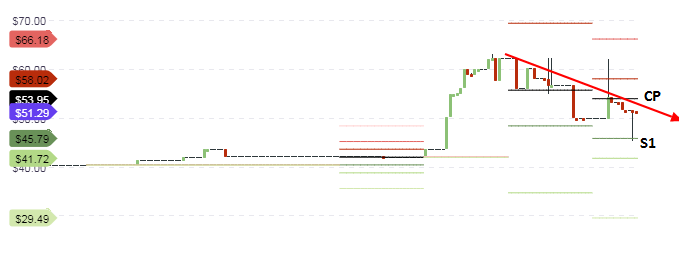 Now that the key levels on the daily chart have been identified, is there an opportunity for day traders? The intraday chart answers this question, with price action already seeing resistance at the central pivot ($53.95) and finding support with a strong bounce off the S1 pivot at $45.79. These price levels are expected to serve as the ceiling and the floor of price action respectively if the intraday candles do not violate any of these lines.