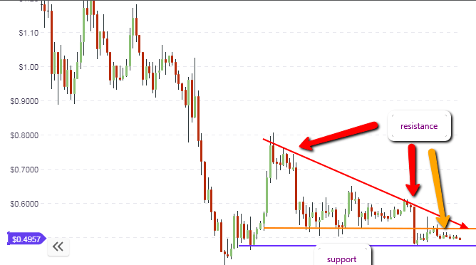 What does this mean for IOTA traders? If price is able to find some strength to bounce off this support line, the price action will find resistance at the 53 cents price area (orange line). The descending trendline resistance will also intersect the initial horizontal resistance at this level. If price breaks this level to the upside, we expect the price action to aim for the next available resistance, depicted by the thin blue line at the 64 cents mark. However, trading volumes have to pick up if any of these price moves are to be witnessed in the next few days to weeks ahead.