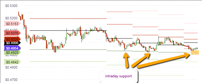 Intraday price action is expected to find support at the S2 pivot line (49.2 cents), which is also where the price found support in the last few trading days. It is worthy to note that the pivot levels have not changed much, indicating how low trading volumes have affected the ability of daily price action to experience some volatility changes. Price action is testing the S1 pivot presently. It may be better to use the S2 pivot area as a better buying price location than any other area for the day.