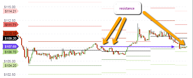 Price action on the intraday chart has broken below the S1 pivot at $106.70. Price had also found resistance here on Sunday, October 21, before it was broken by the price surge of late Monday. However, prices have been able to break below this price level, which is now functioning as a resistance. If this price level holds up, then we can expect a push of price towards the S2 pivot if sellers seize the initiative. However, if both sets of traders are undecided as to what to do, the price may continue to trade around the S1 pivot without breaking it for the rest of the day.
