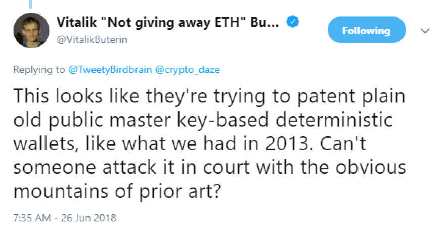 In a tweet, pictured below, Buterin argued against the patent’s validity, saying that this was an already known technology that Ethereum had in 2013. He further suggested that someone should attack the patent’s legitimacy in court for “prior art” infringement.
