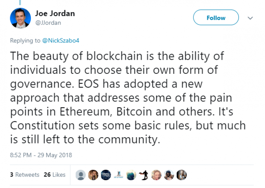 Joe Jordan (@JJordan) tweeted back at Szabo in defense of EOS:
