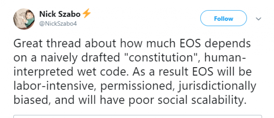 Nick Szabo has called out EOS on Twitter for its dependence on the project's so-called "constitutions", which he dismissed as "naively drafted".