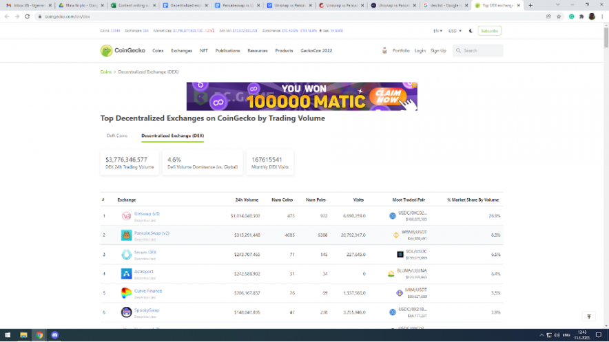 Uniswap offers more than 450 tokens, and more than 900 trading pairs. Pancakeswap clearly wins here, with more than 4000 tokens offered for swap, as well as a whopping 5300 pairs. If you are a trader looking for those juicy 100x tokens, clearly Pancakeswap is the way to go. Number of visits to Pancakeswap clearly indicates more lively market, while Uniswap as older and more reputable, still holds greater market share and greater volume of trade.
