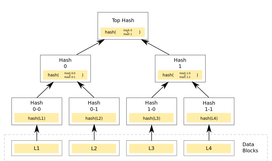 A Merkle tree (also known as a hash tree) is constructed by performing a hash function on each transaction in a block to get a resulting uniquely identifiable ID of each. The a hash is performed on the resulting pairs, then further on the subsequent ones and so on, until they meet in a single hash called the Merkle root.
