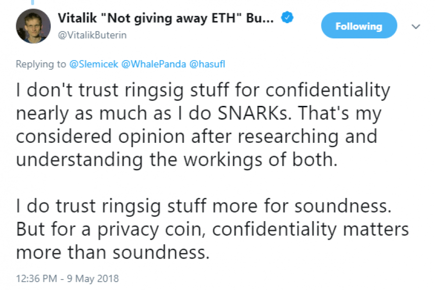 When a user suggested Monero, which uses the Ring Signature technique to offer privacy, was a better option, Buterin made his doubts clear: