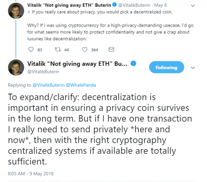 This evoked a response from many social media users, who pointed out that Zcash was centralized in nature and that, in the long term, privacy would be better enabled by decentralized networks. Buterin, an advisor to the Zcash project, made multiple interesting remarks concerning privacy and the decentralized nature of coins.