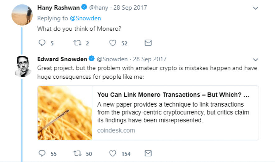 Zcash has also received the backing of arguably the world’s most famous whistleblower, Edward Snowden, champion of individual privacy rights. Late last September, he declared that Zcash was perhaps the most interesting alternative to Bitcoin, because “unlike Bitcoin, it was safe.” Like Buterin, he showed little faith in Monero, calling it an “amateur cryptocurrency.”