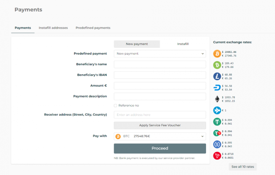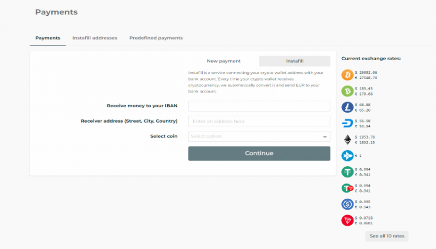 InstaPay: This tool allows users to send digital assets with automatic conversion into EUR to the recipient, specifying the IBAN account. With its help users can make instant transfers to friends, relatives, or pay for purchases using cryptocurrencies.