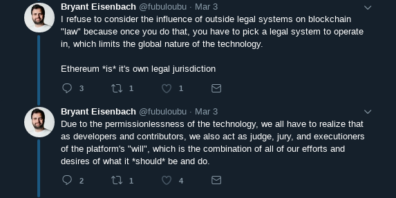 Legal systems as such can be loosely defined as protocols, formal guidelines and procedural frameworks for the management of disputes and in his blog post, Zamfir goes on to identify three generally accepted laws and guiding operative principles of crypto-systems law as applied today in dispute management and blockchain governance. The first law is to not break the protocol (e.g., disputes are never resolved by the introduction of critical bugs or by launching certain attacks just because we can). The second law is to do with keeping things overall legal in the sense of not explicitly being illegal in the terms of the jurisdictions they happen to find themselves at and operate in (this often surfaces in issues that are extremely difficult to resolve, since different jurisdictions do not always cooperate in these matters and some have even taken advantage of this fact to further weaponize and militarize cyberspace).