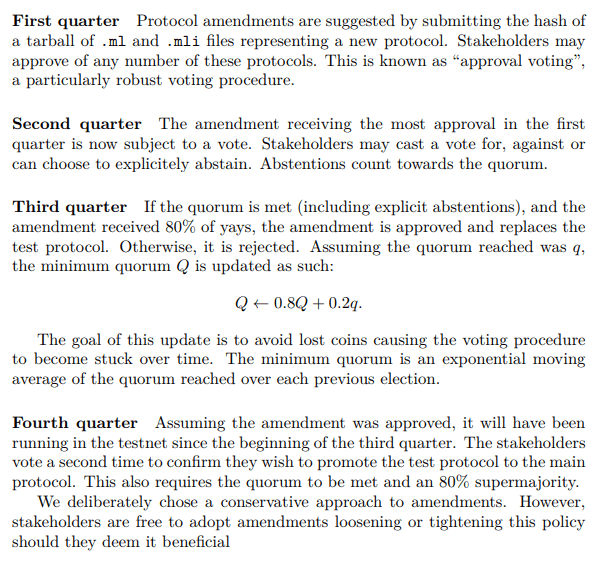 One of the main innovations in Tezos is the incorporation of a formal protocol modification process (as a multi-stage amendment process) in the software code itself, allowing developers to independently submit source code modifications and be paid for it (including a request for compensation with their submission). Once a modification proposal is submitted, stake-holders (“bakers”) vote for or against the modification (with one Tezzie – the system’s native token symbolized by ꜩ and equal to a corresponding vote). At least 80% of stakeholders need to have voted in favor of the proposal for it to pass.