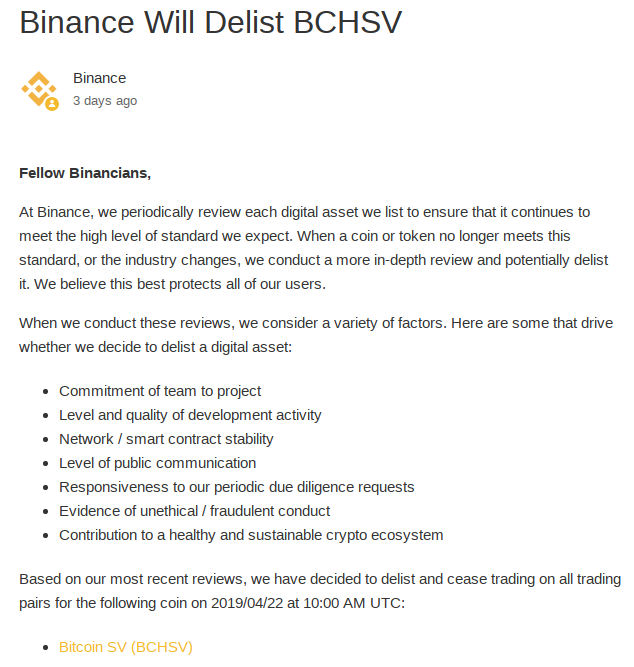 Bitcoin SV (Satoshi’s Vision), the latest schism in the taxonomy of Bitcoin hard forks was recently delisted from Binance, the leading crypto exchange by volume, on the basis of crossing a certain line or — as officially announced, not meeting the exchange’s specified standards of what they are willing to accept and deal with on their platform. Kraken and Shapeshift followed suit shortly after, plunging the price of BSV in the midst of heated Twitter exchanges (see hashtag #DelistBSV).