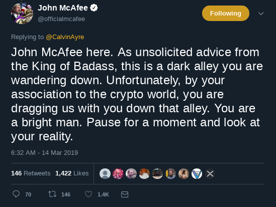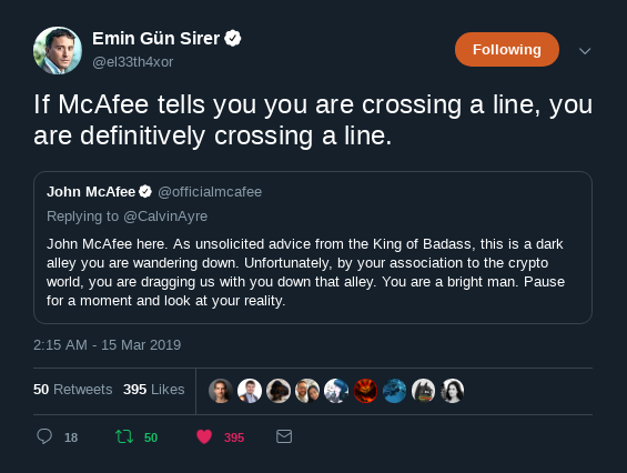 As one might imagine, Ayre’s tweet irritated and outraged many in a community supposedly dedicated to advancing scientific and technological innovation to make the world a better place. While he is better-known than anyone in the crypto space for pushing the sleeze envelope, John McAfee called Ayre out: