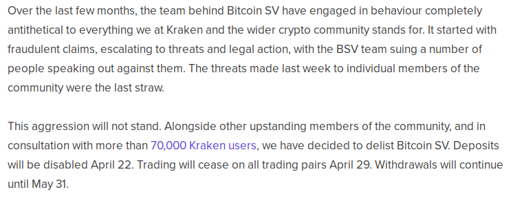 The deplatforming of BSV brings closer to its conclusion an almost year-long chronicle of the familiar Bitcoin adversities, vitriol and nonsense Twitter theatrics that traditionally accompany Bitcoin anything. Although having a small group of dissenting supporters, Wright has been widely denounced by many in the industry as an incompetent fraud, including eventually Binance CEO Changpeng Zhao. The move to finally pull the plug on BSV took place after Wright and Ayre’s persistent bullying and legal threats directed at anybody daring to criticize them ultimately crossed the line when Wright placed a bounty on the identity of Twitter user “hodlnaut” for claiming that he (Wright) is not Satoshi (and therefore, a charlatan).