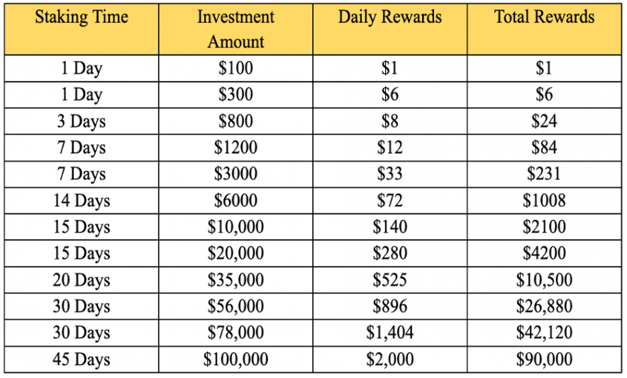 - Free Trial Staking Plan: $100 for 1 day and earn $1 daily.