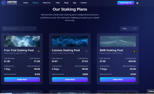 Staking rewards vary based on network participation, staking duration, and platform incentives. UNITED STAKING gives you daily crypto staking rewards, ensuring you get consistent and predictable earnings. They have multiple staking plans for both beginners and experienced investors as shown below: