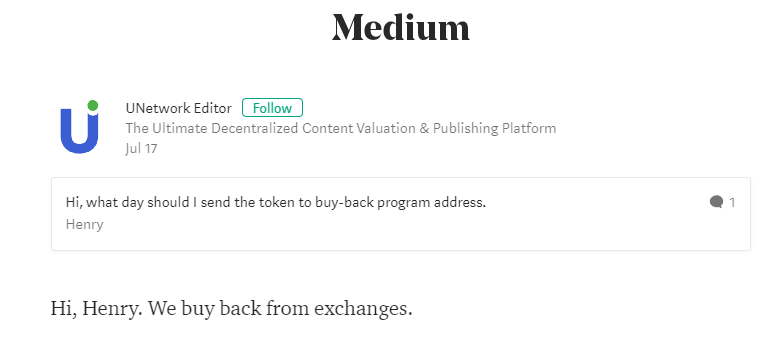 Indeed, the buyback address, published by U Network for transparency reasons, has only been involved in two tiny transactions so far. And in response to a user asking when he could send tokens to the buyback address, U Network simply responded that they “buy back from exchanges,” implying that they are buying from exchange sites, not individuals.