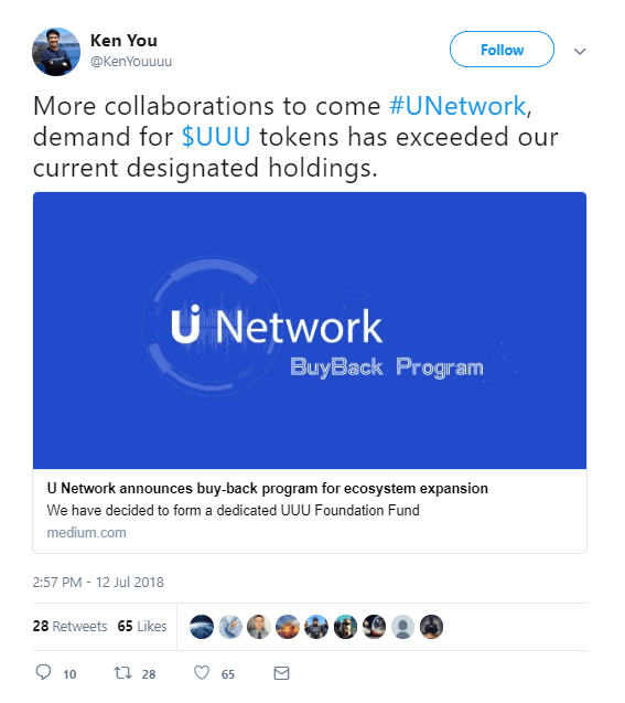 U Network, a blockchain-based content publishing protocol, has officially run out of tokens. Following a Medium publication, the team tweeted that “the demand for UUU tokens has exceeded our current designated holdings,” and that they are now proceeding with a buyback program, which will involve the project repurchasing 1000 ETH (about half a million dollars) worth of UUU tokens.