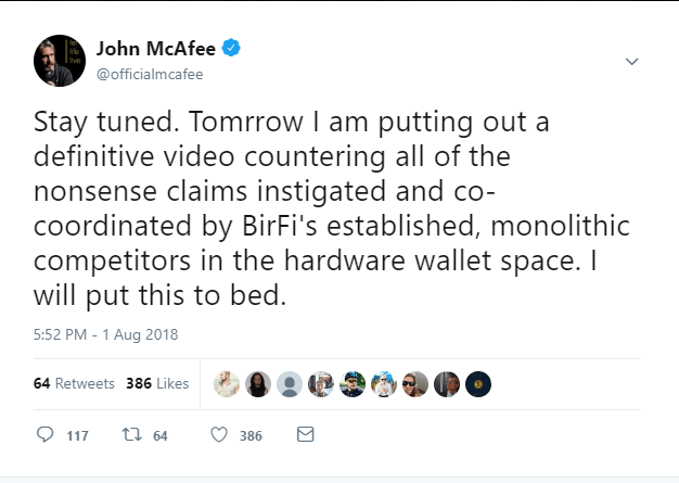 With the amount of backlash Bitfi was receiving on Twitter, John McAfee decided to step in. In a tweet published August 1, he stated,