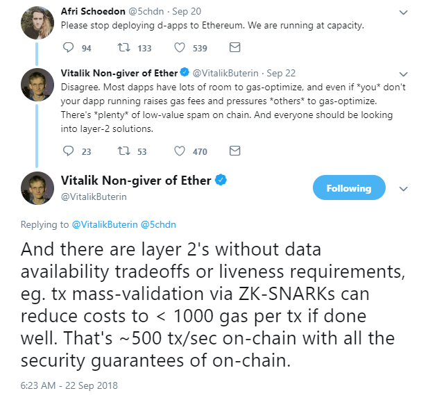 The Ethereum Developer community has been under a huge amount of pressure recently over extended timelines and shifting priorities. Perhaps the biggest issue facing the community is the inability to increase the platform’s transaction capacity. Parity Technologies’ Afri Schoedon recently tweeted that they were running Ethereum at capacity, instructing developers to stop deploying dApps to the network. Buterin disagreed with him, launching a staunch defense with replies to Schoedon’s tweet: