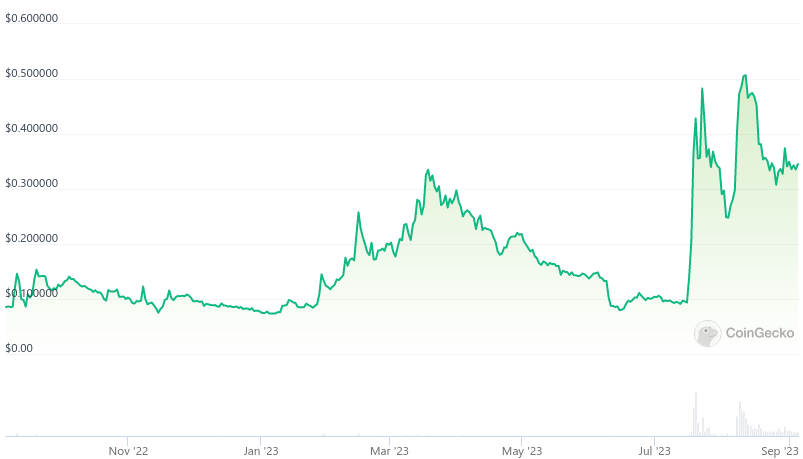 Moons performed exceptionally well in early 2023, gaining 345% in value over the one-year period ending on Sept. 4, 2023. Much of those gains occurred beginning in July as high-profile crypto exchanges began to list the cryptocurrency.
