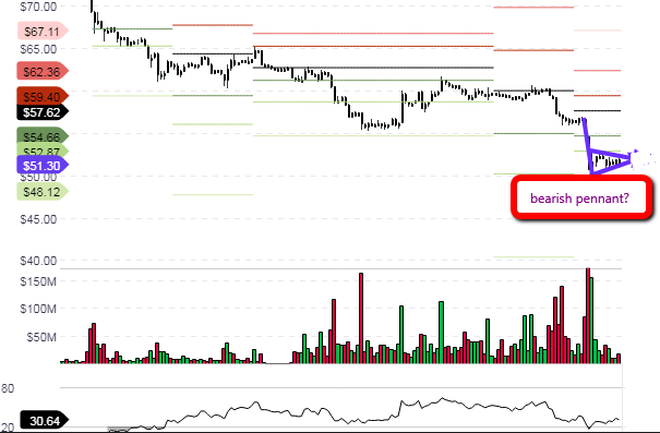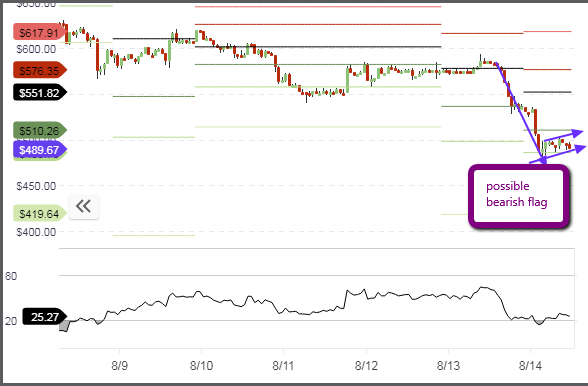 This trade will be dependent on what happens on the weekly chart. If the weekly bar/candle ends up closing below the support line at $510, then this will open the door for the downside break of the evolving bearish flag on the short term chart. So day traders are advised to use the situation on the weekly chart as a guide to the direction of their short-term trades.