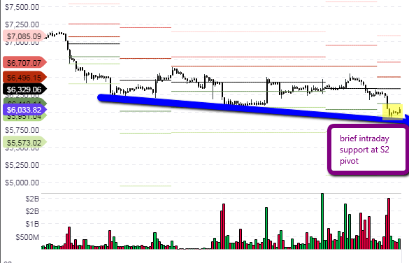 Bear in mind that there is still some room for further downside on the daily and weekly charts before prices hit the $5,700 June 2018 support. Therefore, traders should ideally be ready for a little more downside towards the S3 pivot, so as to make allowance for a little more downside to price action. If the S3 support is not broken, then this may be a better area to take a bounce trade.